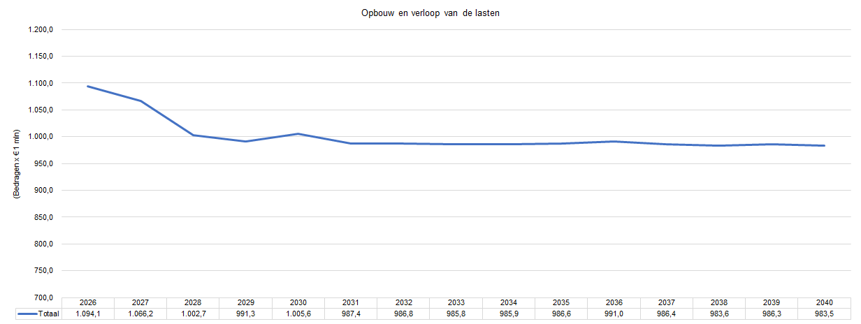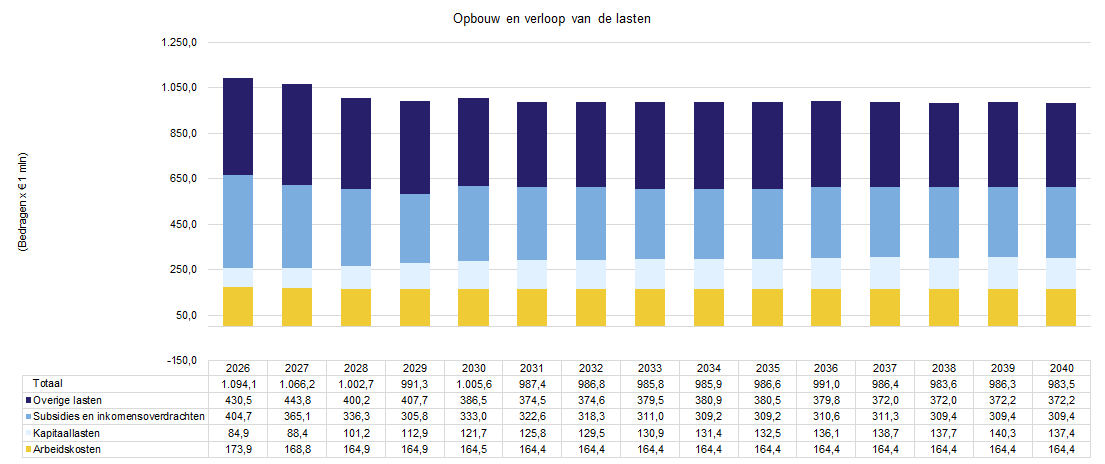 Aansluitend op de Voorjaarsnota 2025, waarin een lasten niveau te zien is van boven de € 1 miljard, laat 2026 een lastenniveau zien van in totaal € 1.094,1 miljoen. Na deze periode zien we een langzaam afnemend lastenniveau tot onder de € 1 miljard vanaf 2028.