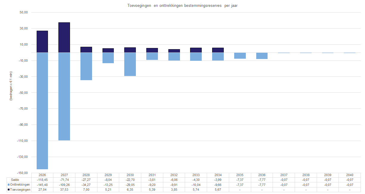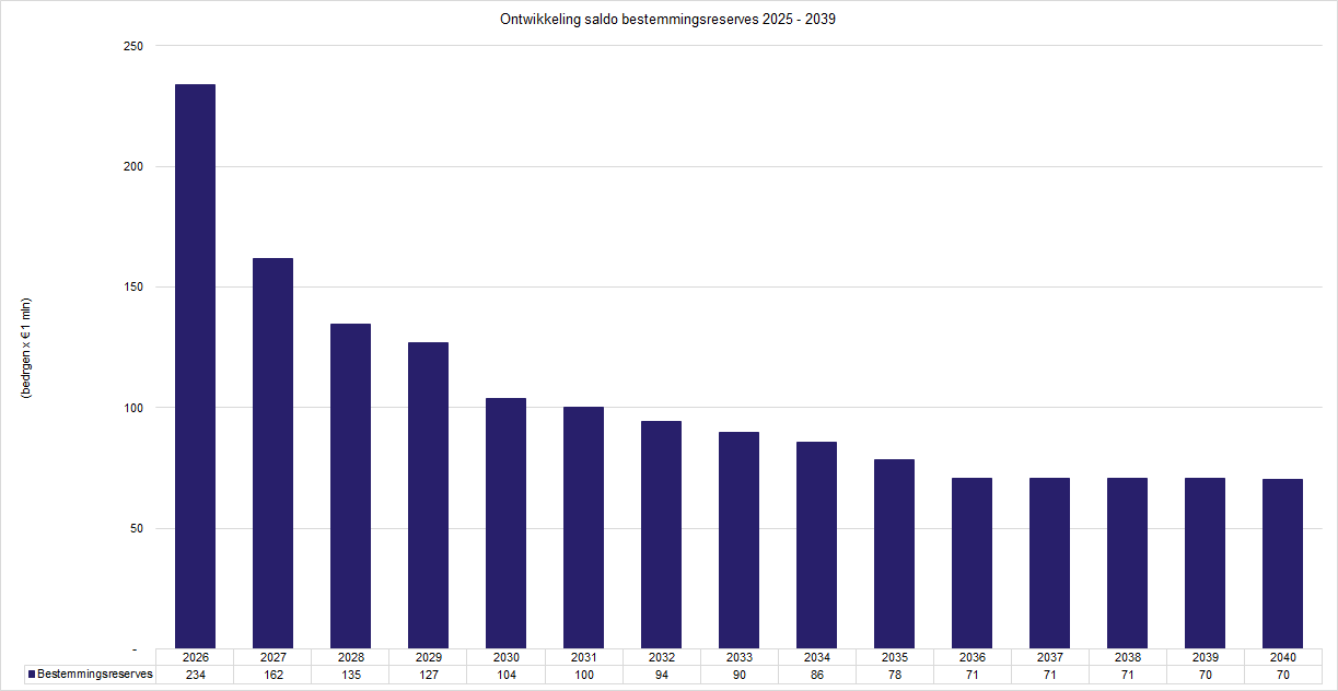 Voor verschillende bestemmingsreserves is de inzet van die middelen nog niet opgenomen in de meerjarige begroting, vooral voor de periode ná 2034. Deze reserves houden daarom een constant saldo. Zodra er een duidelijk beeld is van het verwachte uitgavenpatroon wordt dit opgenomen in de gewone planning- en controlcyclus. Bij het opstellen van de Begroting 2026 worden de bestemmingsreserves opnieuw bekeken, met extra aandacht voor het uitgavenpatroon en de looptijd van reserves die standaard onder het grensbedrag van € 1,5 miljoen komen.
