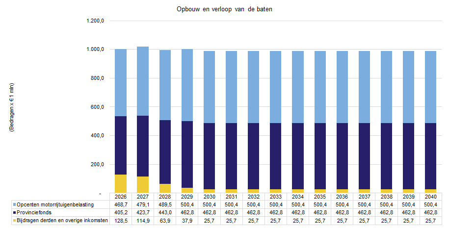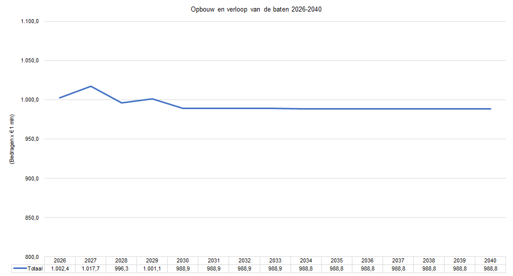 In totaal laten de baten een redelijk stabiel beeld zien met een batenniveau van rond de € 1.000 miljoen maar nooit hoger dan circa € 1.018 miljoen. Daarmee is het batenniveau constanter dan de geraamde lasten.