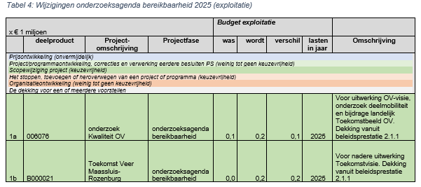 Hieronder zijn de aanpassingen opgenomen voor de onderzoeksagenda bereikbaarheid 2025 met betrekking tot openbaar vervoer. Het gaat om uitgaven voor uitwerking OV visie, onderzoek deelmobiliteit, bijdrage aan landelijk Toekomstbeeld OV en onderzoek naar de toekomst van het Veer Maassluis -Rozenburg. De dekking hiervoor komt vanuit beleidsprestatie (zie ook tabel 1).