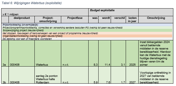 In de reserve is € 1,7 miljoen aan budget beklemd voor realisatie van een 2e ponton bij de Waterbushalte in Rotterdam. De realisatie heeft tot op heden nog niet kunnen plaatsvinden omdat de situatie qua verantwoordelijkheid en bevoegdheid complex is. De verkenningsfase is nog niet afgerond. Omdat de toekomst van de Waterbus nog onduidelijk is ligt de verkenningsfase momenteel stil. De uitgaven voor de realisatie worden vooralsnog begroot in 2027 en later bijgesteld wanneer er meer duidelijkheid is over de toekomst van de Waterbus.