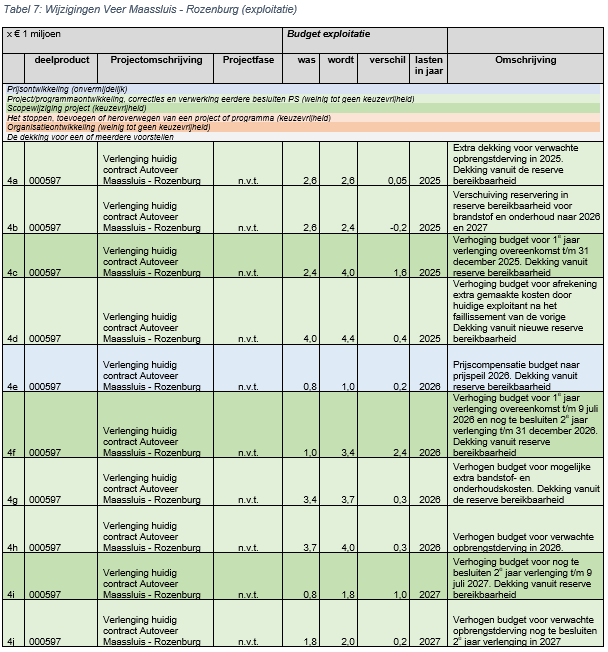 Voor de veerverbinding tussen Maassluis en Rozenburg hebben PS in juli 2023 (nummer 7566) besloten om een tijdelijke exploitatieovereenkomst aan te gaan met. Deze overeenkomst is ter overbrugging van de periode totdat er door middel van een Europese aanbesteding een nieuwe exploitant kan worden gecontracteerd. De tijdelijke exploitatieovereenkomst heeft een looptijd van twee jaar met twee keer een verlengingsoptie van een jaar. De periode van twee jaar is ingegaan op 10 juli 2023 en loopt tot en met 9 juli 2025. Inmiddels zijn de voorbereidingen van start gegaan voor het uitwerken van toekomstscenario’s voor het veer Maassluis-Rozenburg. Het doel is om te komen tot een voorkeursscenario voor de toekomst. De lange doorlooptijd van het voorbereidingstraject en de daaropvolgende contract verlening maakt het noodzakelijk de tijdelijke exploitatieovereenkomst nu met in ieder geval één jaar te verlengen en later mogelijk met nog een jaar. Het voorstel is om voor beide jaren het benodigde budget op te nemen met dekking vanuit de reserve bereikbaarheid. Indien de verlenging voor het 2e jaar niet doorgaat of op een andere manier wordt ingevuld dan zal het budget hierop worden bijgesteld. In de tijdelijke overeenkomst zijn ook afspraken gemaakt over mogelijke extra kostenposten zoals opbrengstderving (als gevolg van opening Blankenburgverbinding) en brandstof- en onderhoudskosten. Hiervoor is budget gereserveerd in de reserve bereikbaarheid. De onttrekking van deze middelen wordt aangepast op basis van wat we nu verwachten. Ook hiervoor geldt dat het budget wordt aangepast wanneer het 2e jaar verlening niet of anders doorgaat.