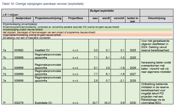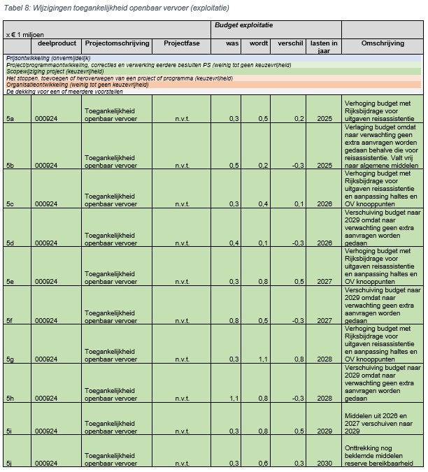 Het toegankelijk maken van openbaar vervoer haltes is een wettelijke taak van de provincie. Hiervoor is een Uitvoeringsprogramma Toegankelijkheid gemaakt. Met het Rijk zijn afspraken gemaakt extra incidentele financiering van het uitvoeringsprogramma naast het huidige structurele budget van € 250.000,- in de provinciale begroting. De uitgaven richten zich vooral op reisassistentie, aanpassing van haltes en openbaar vervoer knooppunten. In 2024 heeft het Rijk middelen uitgekeerd die nu bij de Voorjaarsnota in de begroting worden verwerkt voor de periode 2025 t/m 2028. Het al beschikbare budget voor 2025 wordt zeer waarschijnlijk niet uitgegeven en kan eenmalig vrijvallen naar de algemene middelen. Het structurele budget in de jaren 2026 t/m 2028 wordt verschoven naar 2029 en de nog beklemde middelen in de reserve worden vooralsnog onttrokken in 2030. Hiervoor moeten nog nadere plannen worden uitgewerkt samen met gemeenten.