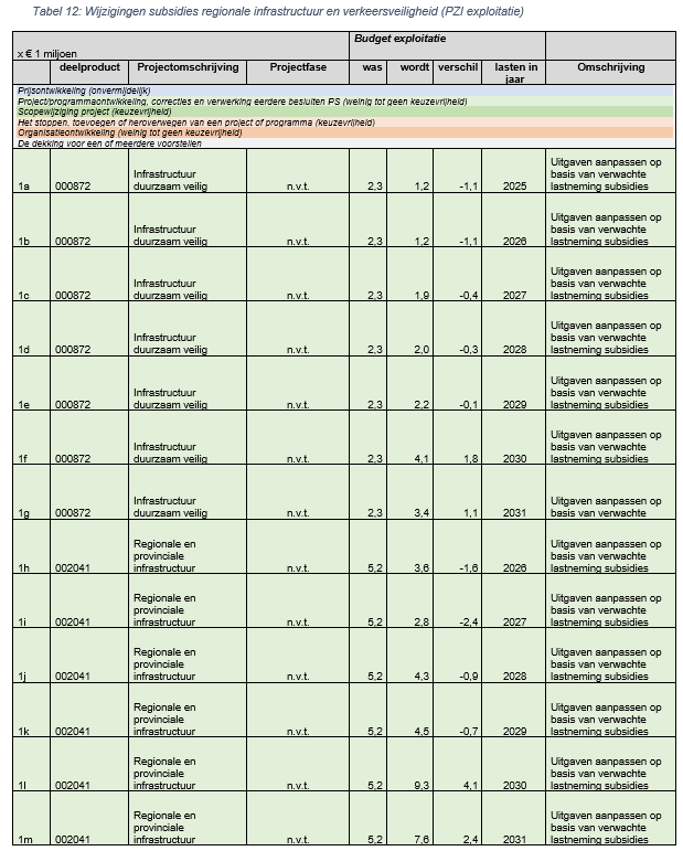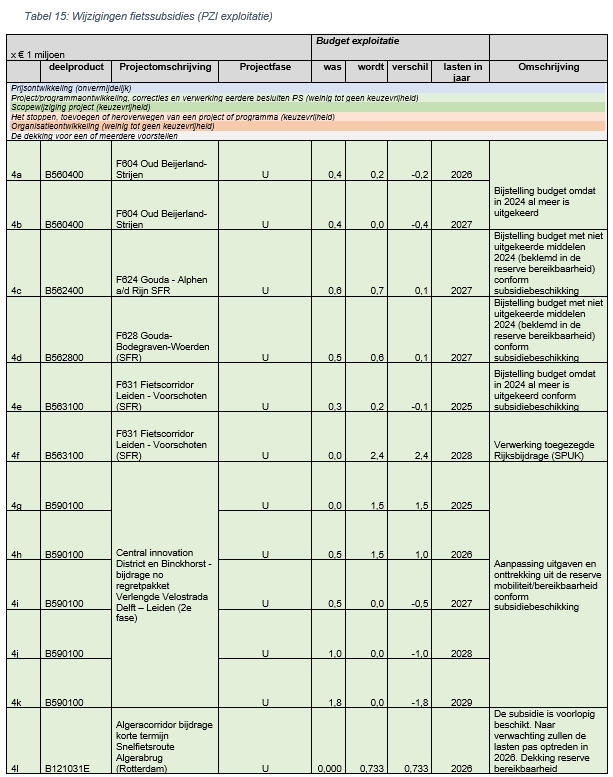 Een deel van fietsprojectsubsidies binnen het PZI zijn gedekt met exploitatiemiddelen vanuit de reserve bereikbaarheid. Wanneer de subsidies daadwerkelijk worden verleend kan het betalingsritme afwijken van wat er in de begroting is opgenomen. Dit betekent dat de begroting hierop moet worden aangepast en ook dat de onttrekking vanuit de reserve kan wijzigen. Dit zijn budget neutrale wijzigingen van de begroting. Daarnaast is voor het project Fietscorridor Leiden – Voorschoten (snelfietsroute) een Rijksbijdrage afgesproken van € 2,4 miljoen als onderdeel van de Tijdelijke stimuleringsregeling slim, veilig, doelmatig en duurzaam gebruik van mobiliteitsinfrastructuur 2023–202. Deze bijdrage zal via een SPUK worden uitgekeerd. Daarop wordt de begroting nu aangepast. De provinciale bijdrage zal samen met de Rijksbijdrage als subsidie worden uitgekeerd aan de gemeente (uitvoerder project).