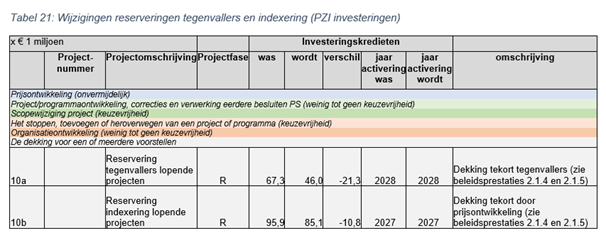 De reservering indexering lopende projecten wordt ingezet voor diverse projecten verspreid over de beleidsprestaties 2-1-4 en 2-1-5. Deze wijziging is de optelsom van de blauw gearceerde wijzigingen (tabellen PZI investeringen).