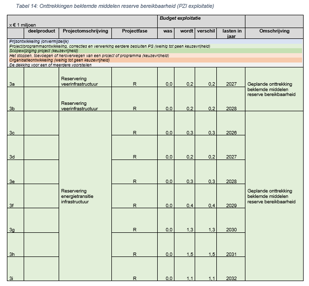 In het PZI is een reservering opgenomen voor veerinfrastructuur van € 0,4 miljoen (exploitatiebudget). De dekking hiervoor komt uit de reserve bereikbaarheid (beklemde middelen). De onttrekking van deze middelen was nog niet opgenomen in de begroting. Dat wordt nu hersteld door budget op te nemen in de begroting. Voor veerinfrastructuur loopt geen initiatiefproject of verkenning conform de PZI spelregels. In plaats daarvan wordt in overleg met de diverse beheerders van veerinfrastructuur in Zuid-Holland jaarlijks bekeken welke projecten in aanmerking komen voor een subsidie (via de Subsidieregeling Mobiliteit). Vooralsnog zijn er nog geen projecten bekend voor 2025 en 2026, daarom worden de middelen opgenomen in de jaren 2027 en 2028. Wanneer concrete projecten bekend zijn wordt de begroting en het PZI hierop aangepast.