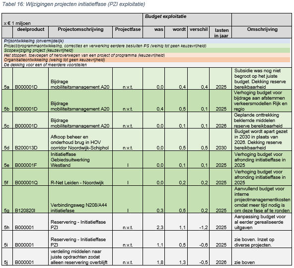 Het huidige PZI 2025-2039 bevat een aantal projecten in de initiatieffase. Voor deze fase is een structureel exploitatiebudget beschikbaar. Als gevolg van het voorstel om de bereikbaarheidsaanpak Zuid-Holland Bereikbaar structureel te dekken (zie beleidsprestatie 2-1-1) is vanaf 2027 € 375.000,- per jaar beschikbaar. Tot die tijd is bijna € 1,3 miljoen per jaar beschikbaar. Er worden nu een aantal voorstellen gedaan om het nog beschikbare budget voor 2025 te verdelen naar projecten. Daarnaast stonden nog een aantal uitgaven begroot met dekking vanuit de reserve bereikbaarheid. Deze uitgaven zijn echter al gedaan en zullen niet meer gerealiseerd worden in 2025. Tot slot wordt het budget voor afkoop beheer en onderhoud van een nog te realiseren brug door provincie Noord-Holland in de Hoogwaardig openbaar vervoerverbinding Noordwijk Schiphol begroot in 2030 in plaats van in 2026. Deze afkoop is gekoppeld aan het PZI project HOV Noordwijk – Schiphol fase 2 bijdrage oeververbinding Lisse-Lisserbroek waarvoor het jaar van oplevering 2030 is. Deze uitgave valt daarmee ook niet meer onder projecten initiatieffase.