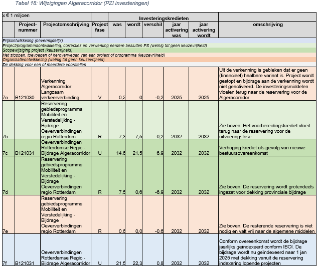 Voor de Algeracorridor is een bestuursovereenkomst afgesloten. Ten eerste is de verkenning naar de langzaam verkeerverbinding afgerond. Uit de verkenning is gebleken dat er geen (financieel) haalbare variant is. Daarom hebben de gemeenten, provincie en de Metropoolregio Rotterdam-Den Haag besloten om dit project te stoppen. Dat betekent dat we de afgesproken provinciale bijdrage aan de verkenning niet mogen activeren. De al gemaakte uitgaven tot dit moment zijn beperkt en komen ten laste van de exploitatie. De investeringsmiddelen voor de verkenningsfase vloeien terug naar de reservering voor de Algeracorridor.