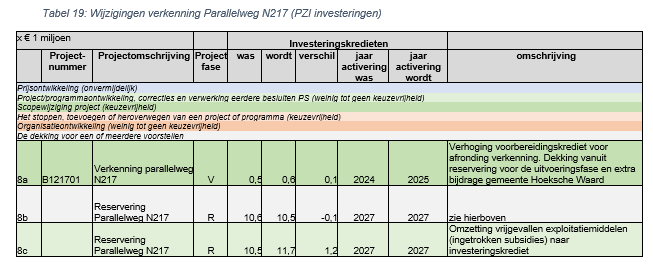 In het PZI 2025-2039 is binnen het PZI financiële ruimte vrijgemaakt om de reservering voor de uitvoeringsfase van dit project te verhogen. Ook de gemeente heeft toegezegd extra bij te dragen. Hierdoor was er voldoende zicht op financiering om de voorkeursvariant verder uit te werken. Dit vindt momenteel plaats. Daarna zal een uitvoeringsovereenkomst met de gemeente worden opgesteld en een uitvoeringsbesluit worden genomen. Het verder uitwerken van de voorkeursvariant en het opstellen van de uitvoeringsovereenkomst brengt extra kosten met zich mee en zorgt dat de afronding van de verkenning verschuift van 2024 naar 2025. Deze extra kosten worden gelijk verdeeld over de provincie en de gemeente. Het voorbereidingskrediet wordt verhoogd, het provinciale aandeel wordt gedekt vanuit de reservering voor de Parallelweg N217.