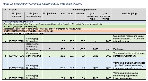 Recent is het uitvoeringsbesluit voor de vervanging van de Concordiabrug genomen. Hiermee is de volledige reservering voor de uitvoeringsfase toegekend (beleidsprestatie 2-1-4). Daarnaast wordt het krediet verhoogd met een bijdrage van de gemeente Gorinchem. Bij het uitvoeringsbesluit is ook besloten om het krediet te compenseren voor prijsontwikkeling naar prijspeil 1 januari 2025. Tot slot is bij de uitwerking van het ontwerp gebleken dat bepaalde werkzaamheden duurder waren dan eerder geraamd. Hierdoor is een tekort ontstaan wat niet het gevolg is van een scopewijziging. Extra cofinanciering is niet mogelijk en versobering van het ontwerp is niet mogelijk zonder dat dit een groot effect heeft op de doelstellingen en hinder voor de omgeving. Er zijn ook geen reserveringen in het PZI voor vaarwegen en/of in dezelfde regio die heroverwogen kunnen worden. Daarom is een beroep gedaan op de reservering in het PZI voor tegenvallers (zie beleidsprestatie 2-1-4).