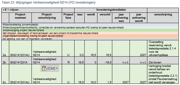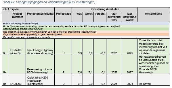 Tot slot zijn er binnen deze beleidsprestatie nog wat kleine wijzigingen en verschuivingen qua planning en financiën. Dit betreft de bij de Jaarrekening 2024 toegelichte correctie voor het project N59 Energy Highway. Omdat het een bijdrage is aan infrastructuur van het Rijk mag de provinciale bijdrage niet worden geactiveerd. De lasten en baten t/m 2024 zijn afgerekend met de exploitatie. Bij de Voorjaarsnota wordt het resterende investeringskrediet verlaagd. Deze middelen vallen vrij naar de algemene middelen waardoor de structurele kapitaallasten worden verlaagd.