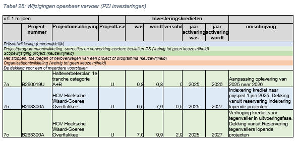 Bij een aantal infrastructuurprojecten voor verbetering van het openbaar vervoer zijn er wijzigingen. Zo is de planning aangepast van het project Halteverbeterplan 1e tranche categorie A+B. Het realisatiebesluit wordt verwacht in Q1 2025 en start uitvoering in Q3 2025. De verwachting is daarom dat de oplevering van het project plaatsvindt in 2026 in plaats van 2026. Dit heeft vooralsnog geen financiële consequenties.